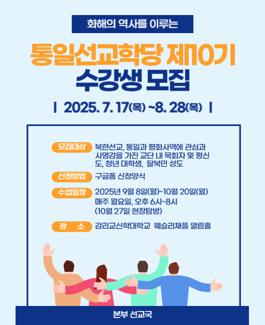 - 기타사항 : 전일정 참석 시 수료증 수여 (1년 과정 수료 후 선교국 통일선교 강사 자격을 부여)